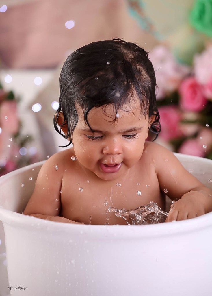 Manu adorou comer o seu bolinho, mas a parte que ela mais gostou mesmo foi o banho!